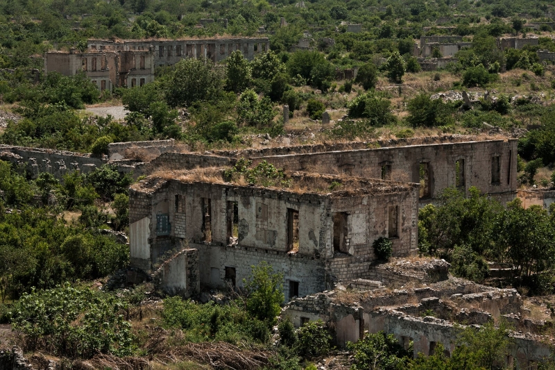 Заброшенные руины азербайджанского города Агдам на линии разграничения огня