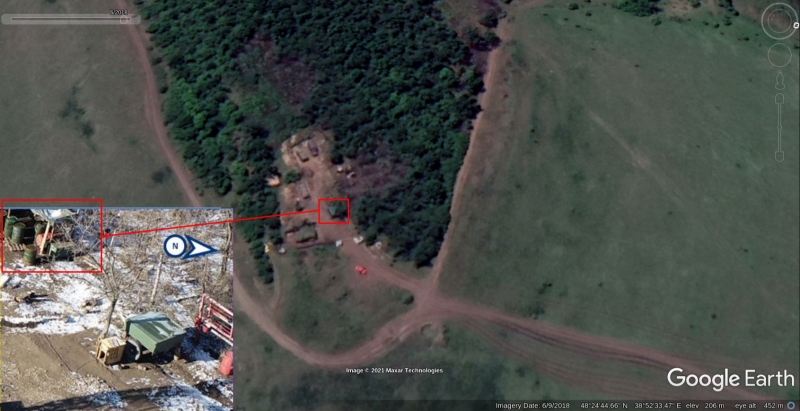 Интересно, что на спутниковых снимках за 2018 год в этом же месте также видно, как хранились бочки с соляркой. А также рядом хранилась не идентифицированная военная техника, накрытая маскировочной сеткой.