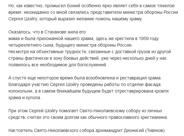 Вообще со Стахановским благочинием интересные дела творятся. Если посмотреть на таблички на храмах г.Стаханова — там много где написано «Луганская епархия». Но эти храмы относятся именно к Стахановскому благочинию Северодонецкой епархии. Именно поэтому бурная деятельность клириков этих храмов включена в «северодонецкий» эпизод «Казаков-разбойников». Стахановская церковная жизнь интересна ещё и тем, что одни и те же священники тасуются между храмами города. Так что с большой долей вероятности можно утверждать, что в «духовно-культурное обслуживание» боевиков-оккупантов были вовлечены все храмы и клирики города. А вот настоятель Свято-Николаевского собора архимандрит Дионисий (Тивяков) хвастается, что этому храму лично помогает министр обороны РФ Сергей Шойгу.
