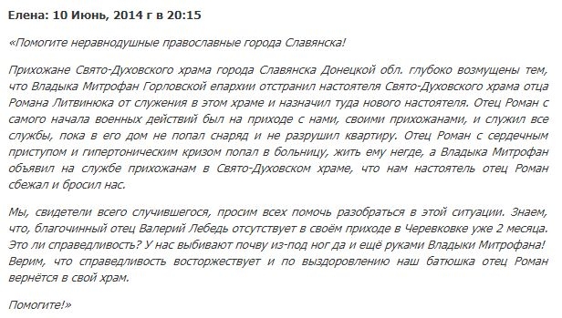 Настоятелем храма незадолго до этого события был Роман Литвинюк. 10.06.2014 г. на закрытом сайте Славянска появляется жалоба прихожанки, что о.Роман смещён с должности, и на его место назначен другой клирик. При этом якобы владыка Митрофан солгал прихожанам относительно причины отстранения их настоятеля («сбежал»), пока священник находился в больнице с сердечным приступом. Ничего необычного для сторонников русского мира, это поведение очень чётко сформулировано российским журналистом Аркадием Бабченко: «Родина тебя бросит, сынок. Всегда».