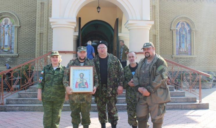 Едва ли не впервые на епархиальном сайте в кадр попадают ополченцы (которых легко узнать по характерным полосатым лентам на колодках медалей бойца). Дебальцево, Александро-Невский храм, 28.06.2015 г.