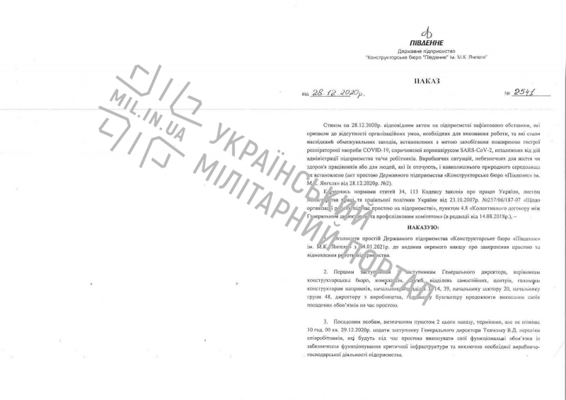 ГП «Конструкторское бюро "Южное" им. М. Янгеля» с 4 января 2021 года снова уходит в простой из-за пандемии COVID-19. В прошлый раз простой предприятия продлился 4 месяца.