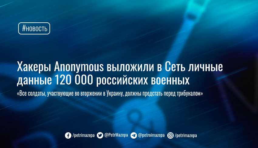 Хакерская группировка Anonymous взломала базы данных Вооруженных сил России и выложила в Сеть личные данные 120 000 российских военных, активно участвующих в военных действиях в Украине.