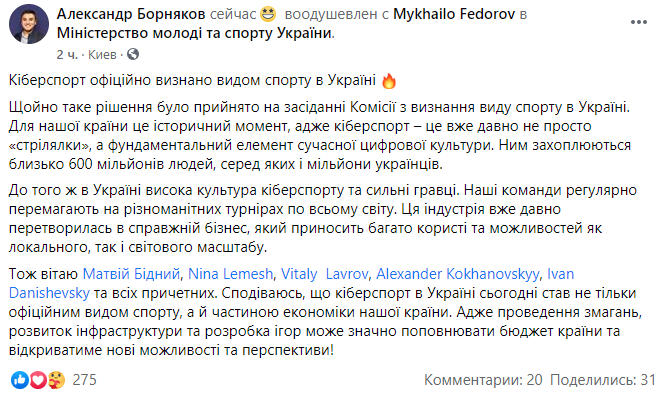 «Для нашей страны это исторический момент, потому что киберспорт – это уже давно не просто “стрелялки”, а фундаментальный элемент цифровой культуры. Им увлекаются более 600 миллионов человек, среди которых есть и миллионы украинцев», - сообщил замминистра. Он также подчеркнул, что признание киберспорта видом спорта важно в том числе и для экономики страны, потому что проведение соревнований, развитие инфраструктуры и разработка игр могут существенно пополнять ее бюджет.
