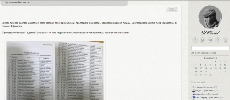 Но среди убитых в Хишаме вполне могут оказаться не только наёмники, но и кадровые российские военнослужащие. Так как после удара американской авиации и артиллерии российское военное командование в Сирии запросило «режим тишины», чтобы забрать раненных и погибших. Как сообщало агентство Bloomberg, раненых доставляли на лечение в военные госпитали МО РФ в Санкт-Петербурге и Москве. В то же время российские спецслужбы бросили все силы на недопущение утечки информации. И даже президент РФ Владимир Путин почему-то отменил часть своих встреч и под предлогом внезапной болезни пропал из информационного поля.