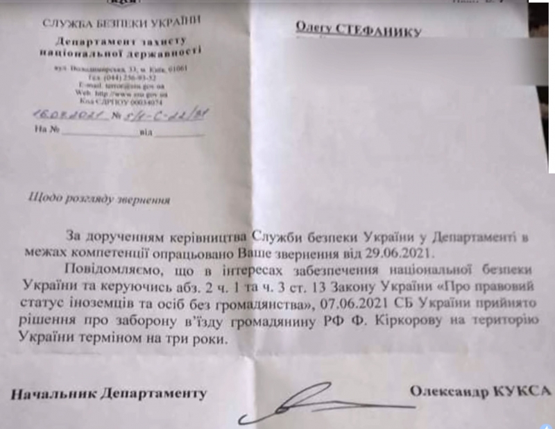 Про запрет для Киркорова Стефаник сообщил в Facebook. Также он предоставил фото самого ответа Сергею Стерненко, который продемонстрировал копию документа в своем видеоблоге.
