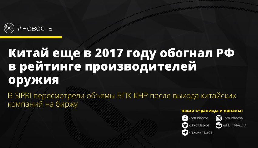 В SIPRI подметили, что в 2017 году в топ-20 производителей оружия входили 11 американских, шесть европейских и три российских компании. Но, если бы рейтинг составлялся сейчас, учитывая обновленную информацию об объемах военно-промышленного комплекса Китая, все четыре китайских компании вошли бы в топ-20, при этом три из них — в первую десятку.