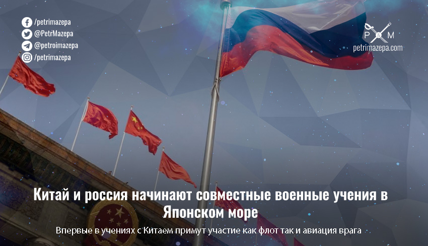 Китайская флотилия вышла в море для встречи с российскими военно-морскими и воздушными силами в Японском море — там они проведут совместные учения для «обеспечения безопасности стратегических водных путей». Впервые в совместных учениях с Китаем будут участвовать как флот, так и авиация страны-агрессора.