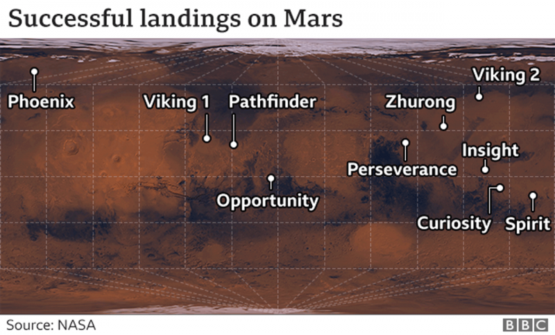 Зонд приземлился в южной части равнины Утопия, сообщает Китайское национальное космическое управление (CNSA). Зонд стартовал с Земли 23 июля 2020-го и уже 10 февраля успешно вышел на орбиту Марса. Затем было три месяца исследований и подготовки к плавной посадке.