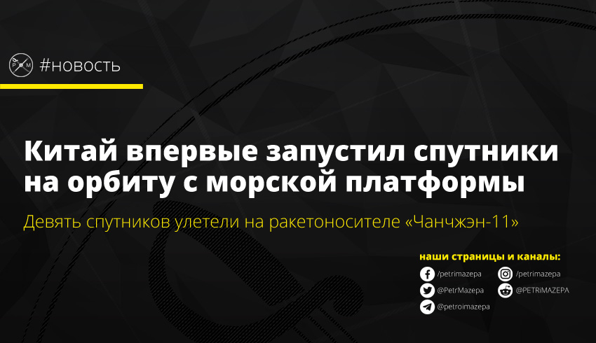 Китай успешно запустил на орбиту девять спутников с помощью ракетоносителя «Чанчжэн-11» - первого в стране ракетоносителя морского базирования. Все девять спутников будут предоставлять данные дистанционного зондирования для служб обследования земельных ресурсов страны, городского планирования и мониторинга стихийных бедствий.
