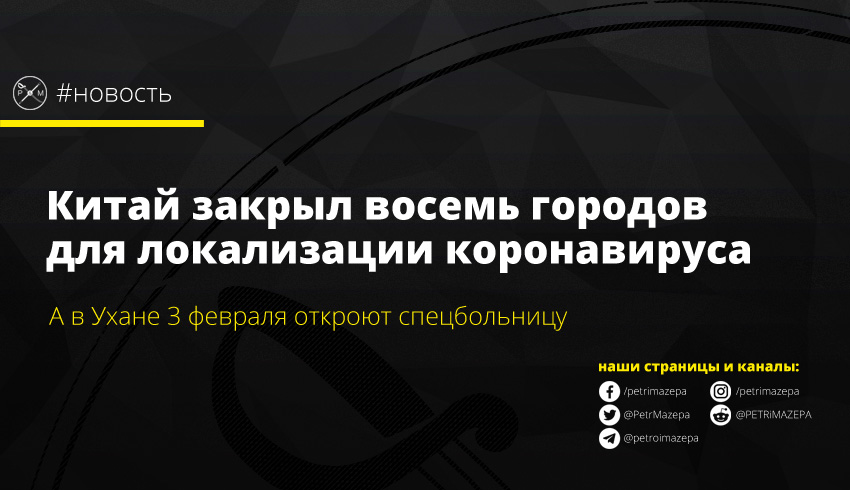 В Китае (население около 1,4 млрд человек) сообщили, что на утро 24 января количество зараженных новым коронавирусом на территории страны достигло 830 человек и 26 из них уже погибли. Поэтому было решено принять дополнительные меры по локализации вспышек болезни и «закрыть» еще семь городов (с учетом восьмого Уханя общее население 25 млн человек). С ними прекращено транспортное сообщение.