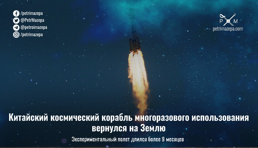 Китайский экспериментальный космический аппарат многоразового использования вернулся на Землю в понедельник утром. Таким образом он успешно завершил 276-дневные испытания.