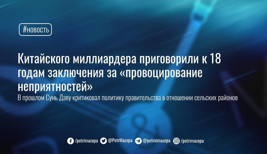 Его признали виновным в том, что он «устраивал ссоры и провоцировал неприятности». Сунь Даву управляет одним из крупнейших частных сельскохозяйственных предприятий страны в северной провинции Хэбэй, сообщает The Guardian. Приговор был вынесен после нескольких недель тайных слушаний.
