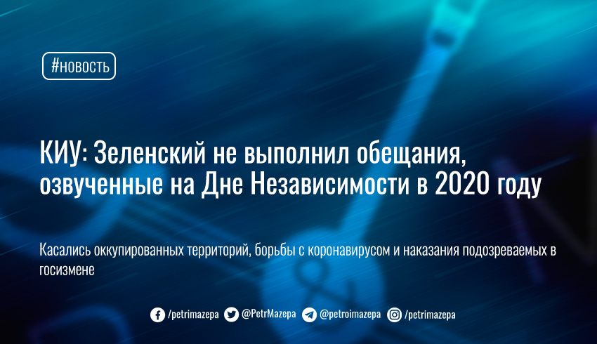 Комитет избирателей Украины (КИУ) проанализировал выполнение обещаний президента Владимира Зеленского, которые были озвучены во время выступления по случаю Дня Независимости в 2020 году. Заявления президента касались соблюдения режима тишины на Донбассе, борьбы с эпидемией коронавируса, возвращения оккупированных территорий Украины, а также наказания лиц, подозреваемых в государственной измене.