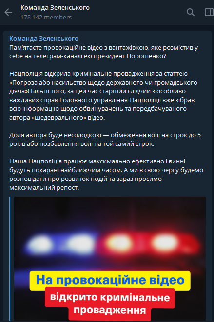 Команда Зеленского в Telegram сообщает, что нашли автора ролика с грузовиком