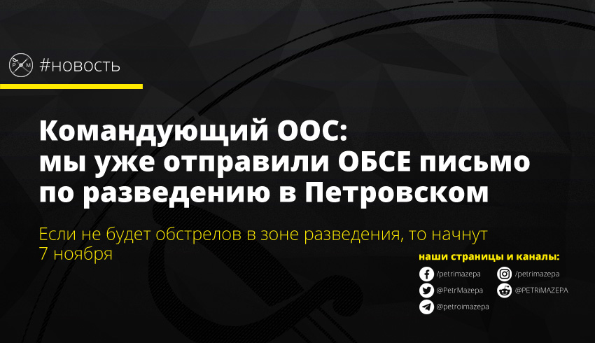 Командующий ООС Владимир Кравченко сообщил, что разведение сил в Петровском может фактически состояться уже 8 ноября. И письмо в ОБСЕ по этому поводу уже отправлено.