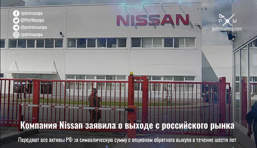 Японская автомобильная корпорация Nissan Motor во вторник объявила о полном выходе с российского рынка и продаже своих российских активов. В пресс-релизе говорится о продаже российских подразделений NAMI — Центральному научно-исследовательскому институту автомобилей и двигателей. По данным росСМИ, продажа состоится за символическую сумму с опционом обратного выкупа в течение шести лет.