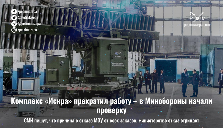 Главный разработчик и производитель наземной радиолокационной техники оборонного комплекса Украины, НПК «Искра» прекращает работу. СМИ со ссылкой на сообщение представителей «Искры» сообщают, что причина в отказе Минобороны от всех заказов, что привело к отмене Гособоронзаказа. В Минобороны опровергают отказ от заказов, и уже начали проверку.