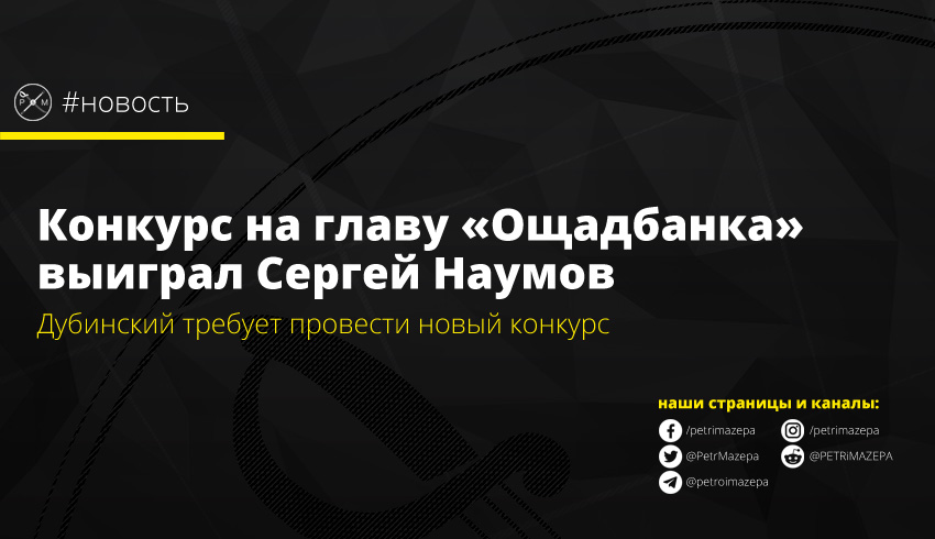 В конкурсе на главу правления «Ощадбанка» победил Сергей Наумов, руководитель «Пиреус Банка». Народный депутат Украины, председатель Киевской областной организации партии «Слуга народа» Александр Дубинский требует признать конкурс по отбору главы государственного «Ощадбанка» несостоявшимся и провести новый конкурс.