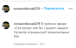 Сегодня ночью она выложила в Instagram тезисы своего выступления в эфире вечернего шоу одного из самых влиятельных СМИ в Италии — телерадиокомпании RAI. Там она рассказывала, что «русофобия недопустима» и «русские люди не должны нести коллективную ответственность за происходящее на Украине». Якобы вина лежит только на путине.