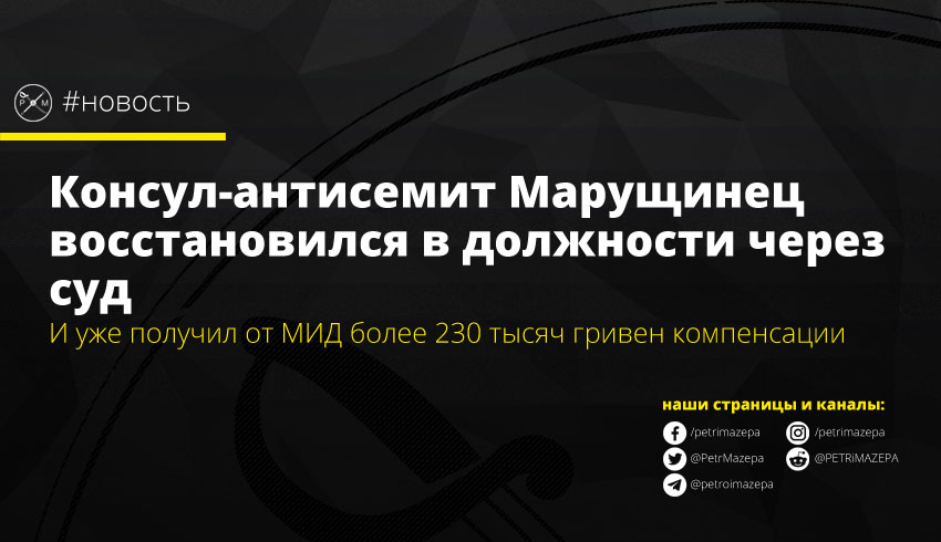 Бывший консул Украины в Гамбурге Василий Марущинец, уволенный в результате антисемитского скандала, добился в суде своего восстановления в должности. Более того, МИД обязали выплатить Марущинцу всю сумму среднего заработка за время вынужденного прогула – более 230 тысяч гривен.