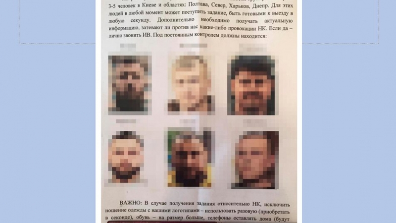 В рамках дела Ширяева были проведены 9 обысков – все под видеозапись и при участии адвокатов. В одном из помещений была выявлена плантация конопли, средства поражения, мобильные телефоны и бланк. На бланке отмечалось, что в Киеве, Полтаве, Северодонецке, Харькове и Днепре должны быть готовы к выезду в любую секунду группы из 3-5 людей – им в любой момент могло поступить задание. В документе шла речь о представителях «Нацкорпуса», и были фотографии шестерых человек, которые как сообщили в СБУ являются лидерами групп, имеющих четкую проукраинскую позицию, поддерживающих суверенитет и целостность нашей страны.