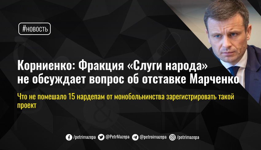29 апреля на сайте Верховной рады появилась страница «Проект Постановления об увольнении Марченко С.М. с должности министра финансов Украины». 15 из 17 авторов этого проекта – представители «Слуги народа». А уже 30 апреля глава партии «Слуга народа» Александр Корниенко заявляет, что фракция этот вопрос «не обсуждает».