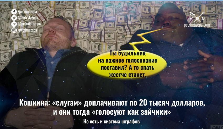 «Эти люди сидят и голосуют, за что им платят. Платят 20 [тысяч долларов]. Для человека, который не имеет, например, образования и который работал свадебным фотографом, это огромные деньги. Поэтому они голосуют как зайчики. Существует система штрафов. <...> Зависит от того, какова степень вины. Если ты в зале и не голосуешь, то разговоры о том, что ты вышел в туалет или пошел поесть — это никого не гребет. Но существуют законы, за которые могут и пять, и десять [тысяч долларов] снять», — цитирует Кошкину «НВ».