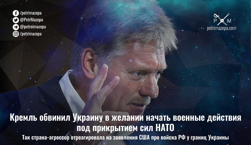Пресс-секретарь президента РФ Дмитрий Песков назвал информацию об угрозе нападения на Украину искусственно созданной истерикой. И с бросился в информационную атаку, принявшись обвинять США в нагнетании ситуации и накачки войсками Европы, а Украину – в желании начать военную операцию под прикрытием сил НАТО.