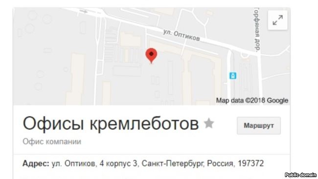 «Фабрика троллей», когда-то работавшая в Ольгино, а затем на улице Савушкина, теперь существует по новому адресу в Петербурге: улица Оптиков, д. 4, корпус 3. Забавно, что гугл-карты выдают при поиске этого адреса «офисы кремлеботов».