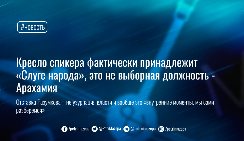 Глава фракции «Слуга народа» Давид Арахамия заявил, что кресло главы Верховной Рады сейчас фактически принадлежит его фракции, и если глава парламента больше не относится к «слугам народа», то его просто сменят. А мнение о том, что должность спикера парламента выборная Арахамия назвал фантазиями. При этом в Конституции Украины четко указано – Верховная Рада выбирает спикера из состава депутатов.
