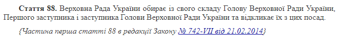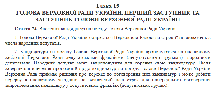 Согласно тексту Статьи 88 Конституции Украины, глава парламента – это не делегированная должность. «Верховная Рада избирает из своего состава Главу Верховной Рады Украины, Первого заместителя и заместителя Главы Верховной Рады Украины и отзывает их с этих должностей», - гласит первый абзац статьи.