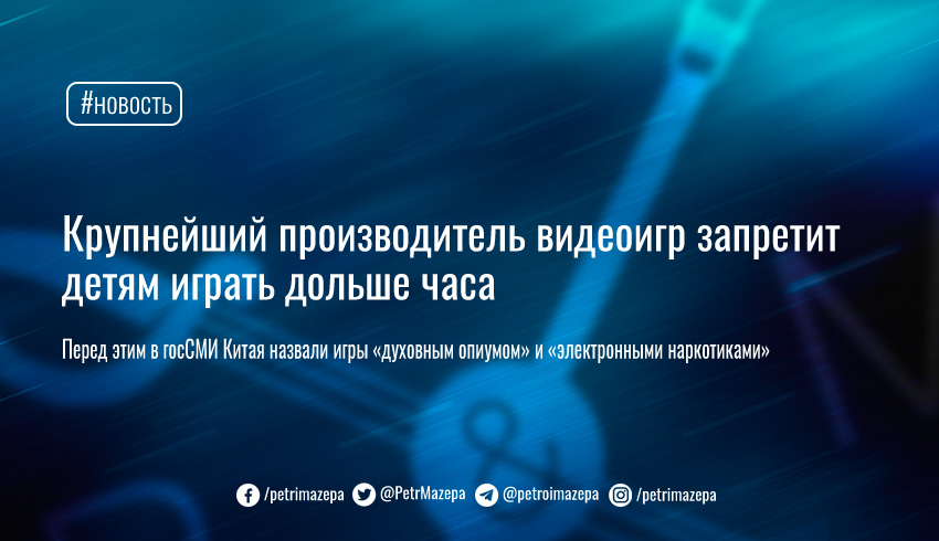Крупнейший в мире производитель видеоигр Tencent Holdings запретит несовершеннолетним играть в свои видеоигры дольше 1 часа в будний день. С таким призывом в компанию обратилось государственное СМИ Китая The Economic Information Daily, назвав игры «духовным опиумом» и «электронными наркотиками».