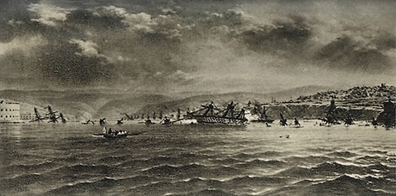Через месяц российская черноморская эскадра атакует турецкую, стоящую под защитой береговых батарей у города Синоп. Русские корабли подходят вплотную к турецким, становятся на якорь и открывают пальбу из всех орудий. Турецкая эскадра превращена в груду пылающих обломков, вместе с ней сгорает и город, гибнет гражданское население. Английские газеты живописуют мучения невинных турок, а также утверждают, что русские варвары добивали турецких моряков в воде.