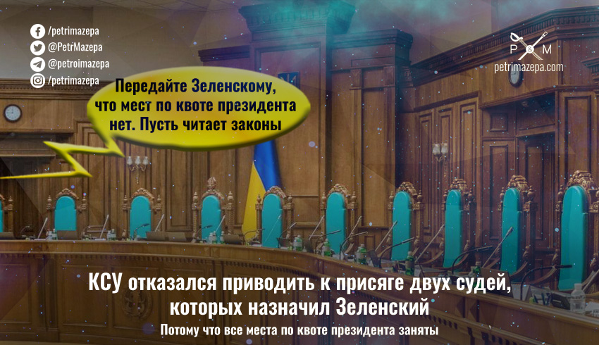 • 27 марта президент Владимир Зеленский отменил указы беглого экс-президента Виктора Януковича о назначении Александра Тупицкого и Александра Касминина судьями КСУ «ради обеспечения национальной безопасности». И заявил, что те «могут отправляться на заслуженный отдых».