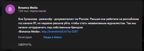 Удивительная сосредоточенность на одной катастрофе для небольшого медиа. Еще и первые два ролика о том, как BBC «ложно» обвиняло в нечестности создательницу этого медиа Яну Ерлашову. В Facebook она представляет себя как «документального кинорежиссера. Основательницу и владелицу Bonanza Media, платформы для независимых журналистов».