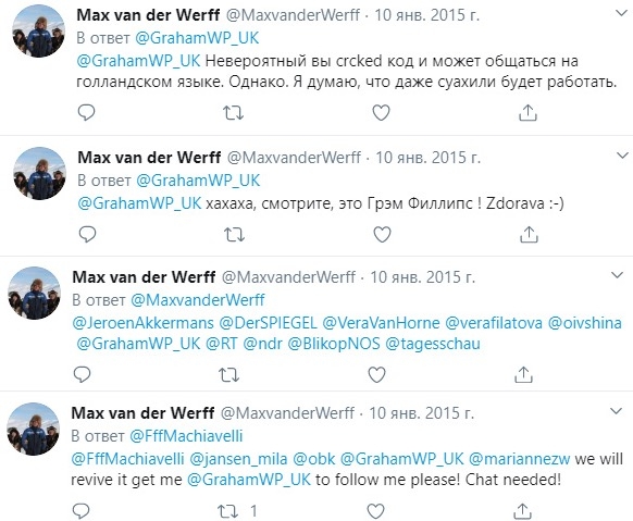Многое о деятельности ван дер Верфа рассказывает его Twitter. А точнее – поиски по твитам времен горячего противостояния на Донбассе. Вот он активно общается в 10 январе 2015 года со своим коллегой по кормушке Гришкой Филлипсом, которого только такой же пророссийский Шарий считает «независимым журналистом».