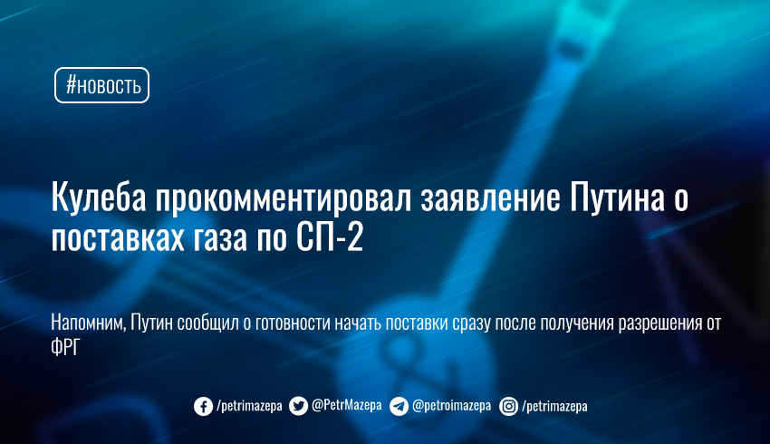 Министр иностранных дел Дмитрий Кулеба назвал шантажом заявление президента России Владимира Путина о готовности начать поставки газа по газопроводу «Северный поток-2» на следующий день после получения соответствующего разрешения от немецкого регулятора.