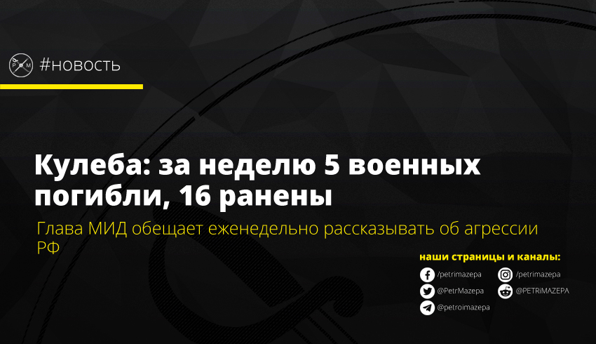 Пятеро военнослужащих ООС погибли из-за российской агрессии и 16 были ранены – такую статистику за прошедшую неделю привел в Twitter глава МИД Дмитрий Кулеба. Он пообещал каждую неделю публиковать ветку о российской агрессии, пока нет реального прекращения огня на линии соприкосновения.