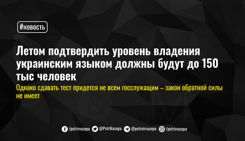 Глава Национальной комиссии по стандартам государственного языка Орися Демська сообщила, что начиная с 16 июля 2021 года около 100-150 тысяч человек будут должны засвидетельствовать уровень владения украинским языком, сдав экзамен.