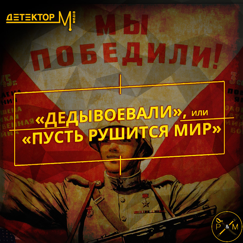 А что сегодня говорит российская пропаганда? «Дедывоевали». Для сегодняшней молодёжи, которой этот посыл и адресован, кстати говоря, давно уже не деды, а прадеды или, скорее, даже прапрадеды. Сами россияне рассказывают: в их стране нередко в адрес пожилых людей звучит уважительное: «Вы же с немцами, с фашистами воевали!». Этим вот «дедывоевали» российская пропаганда, помимо всего прочего, лишает аудиторию чувства реального времени, создаёт ощущение, словно Вторая мировая война была совсем недавно, словно она всё ещё актуальна не как исторический, но как политический факт. Не раз приходилось встречать сообщения: в официальных мероприятиях в России принимают участие фальшивые ветераны — даже на мавзолее во время парадов, рядом с членами российского правительства, стоят люди, представляемые как ветераны Второй мировой (или, в российском контексте, Великой отечественной) войны, выглядящие от силы на семьдесят с небольшим. Откровенный подлог, но россияне его глотают: пропаганда с её «дедывоевали» лишила их осознания, сколько на самом деле времени прошло. Типичная, кстати, для проповедующей традиционализм страны отсылка ко времени «дедов», хронологическая фиксация мифологизированного «золотого века»: российская пропаганда предлагает таким вот «золотым веком» считать войну 1941–1945 годов.