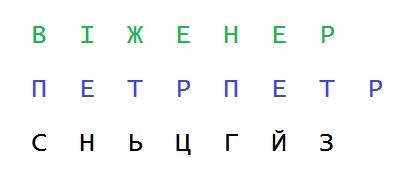 Обе эти проблемы были отчасти решены в шифре Виженера. Суть такова: задаётся некоторое секретное слово (ключ шифрования), которое записывается вдоль текста много-много раз. «Зашифрованную» букву получают как в шифре Цезаря, прибавляя букву текста к букве ключевого слова. Например, чтобы зашифровать букву «І» в примере ниже, нужно использовать «Е». «Е» стоит в алфавите на седьмом месте, поэтому сдвигаем «І» на семь позиций и получаем «Н».