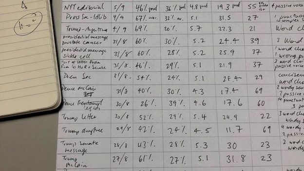 Сравним это с материалами пресс-секретаря Белого дома Сары Сандерс по Сирии 4 сентября (в среднем 31 слово) и письмом Трампа Сенату 28 августа (30 слов в предложении).