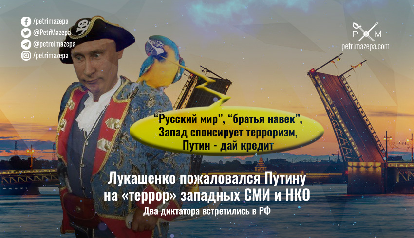 Президент РФ Владимир Путин встретился с Александром Лукашенко в Санкт-Петербурге. Лидер страны-агрессора рассказал, какой хороший партнер Беларусь и как она хорошо обслуживает кредиты, в ответ на что Лукашенко пожаловался ему на «насаждение террора и демократии» со стороны НКО, НПО и западных СМИ, пообещал всех «вычислить и привлечь к ответственности», и «выдержать все вместе с Россией».