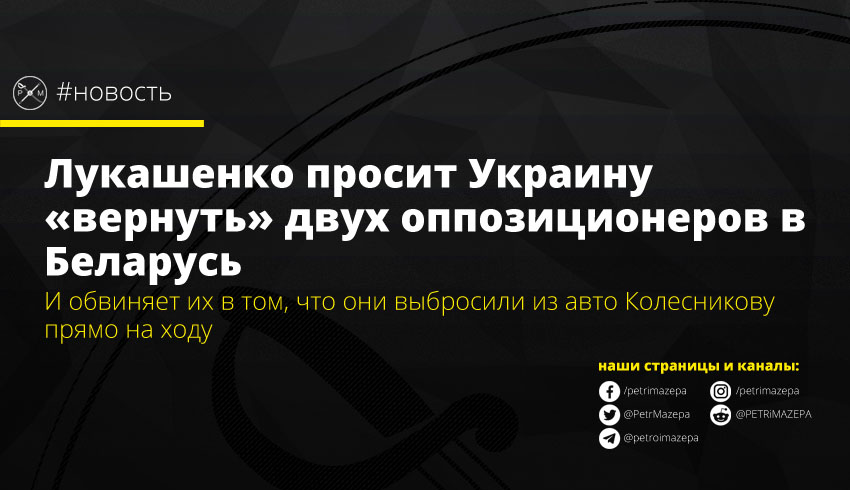Исполняющий обязанности президента Беларуси Александр Лукашенко заявил, что они просят Украину «вернуть нам в страну» двух членов Координационного совета оппозиции Ивана Кравцова и Антона Родненкова. Он также обвиняет оппозиционеров в том, что они выбросили из машины на ходу свою соратницу, Марию Колесникову.