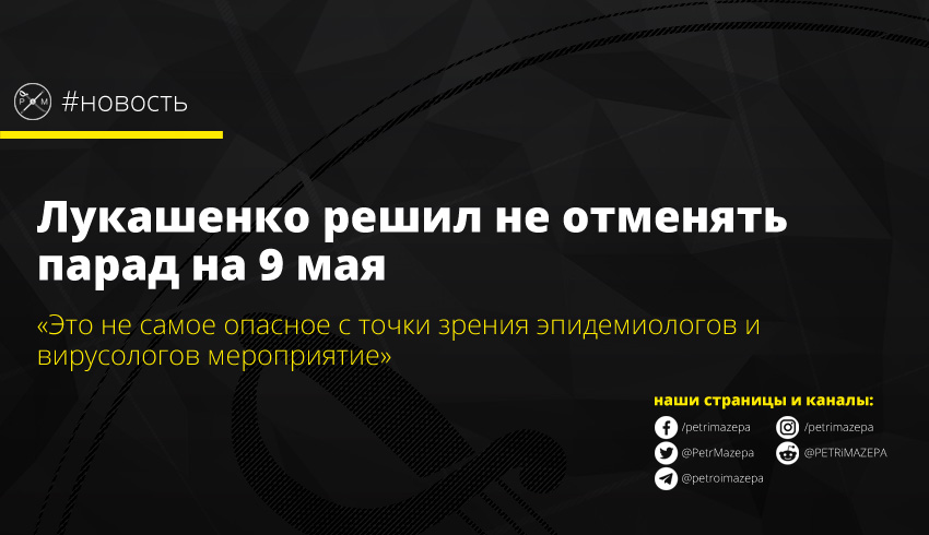Президент Беларуси Александр Лукашенко заявил в воскресенье, что не может отменить военный парад к 9 мая в честь 75-летия Победы в связи с пандемией коронавируса, поскольку речь идет о «глубоко идеологической вещи». Президент уверен, что парад – «это не самое опасное с точки зрения эпидемиологов и вирусологов мероприятие».