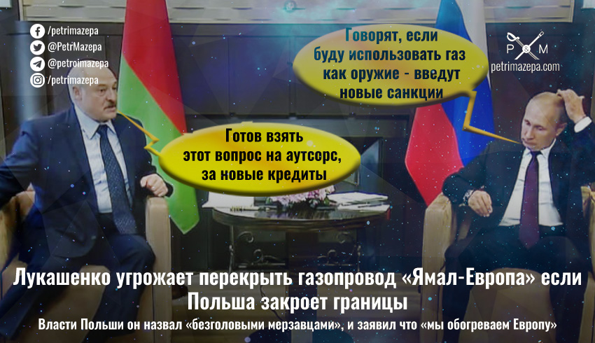 Глава режима Беларуси Александр Лукашенко угрожает перекрыть газопровод «Ямал-Европа», закрыть транзит и «перекрыть газ», если Европа примет решение закрыть границы.