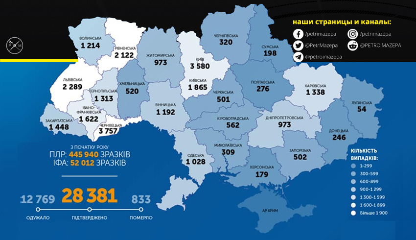 В Украине подтверждено 28381 случай COVID-19, из них 12 769 выздоровели (+357 за сутки), 833 умерли (+23). За последние сутки лабораторно подтверждено 525 случая. Всего исследовано методом ПЦР 445 940 образцов (+8467) и 52012 образцов - методом ИФА (+5733).
