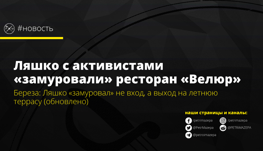 Обновлено: экс-нардеп Борислав Береза сообщил, что на самом деле Ляшко и активисты заблокировали не вход в ресторан, а выход на его летнюю террасу. Сам же вход в «Велюр» остается открытым.