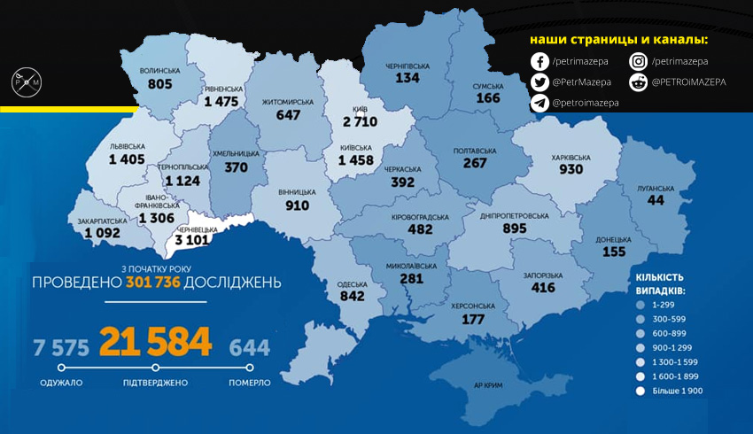 Всего в Украине подтверждено 21584 случая COVID-19, из них 7575 выздоровели (+341 за сутки), 644 умерли (+21). За последние сутки лабораторно подтверждено 339 случаев. Всего в Украине исследовано 301 736 образцов методом ПЦР, в том числе – 9653 за последние сутки.